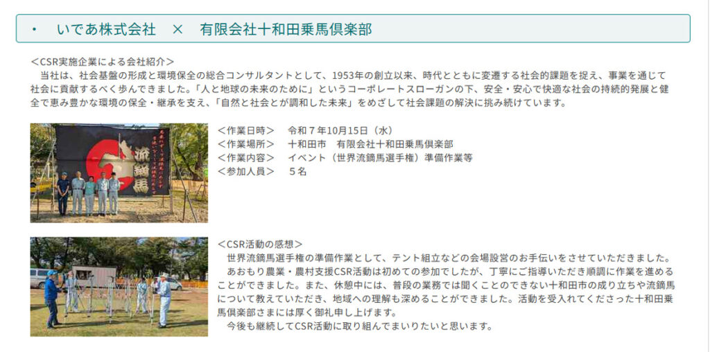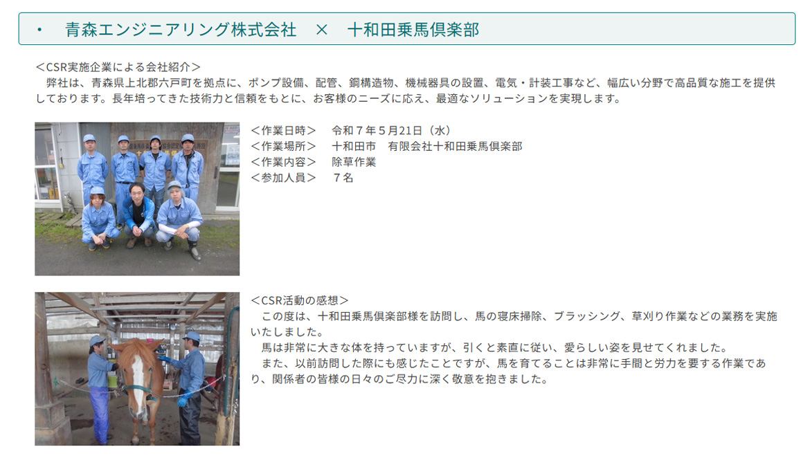 十和田乗馬倶楽部では、CSR(企業の社会的責任)活動を支援し、社会貢献活動の場を提供しています。その内容は厩務・牧場整備・イベント補助など多岐にわたります。共に農村活性・地域活性に取り組んでいただけるパートナーをお待ちしています。