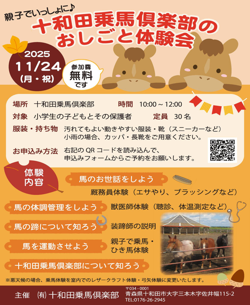 お世話や管理まで、いろんな“乗馬クラブのおしごと”を親子で体験できる特別な1日!
