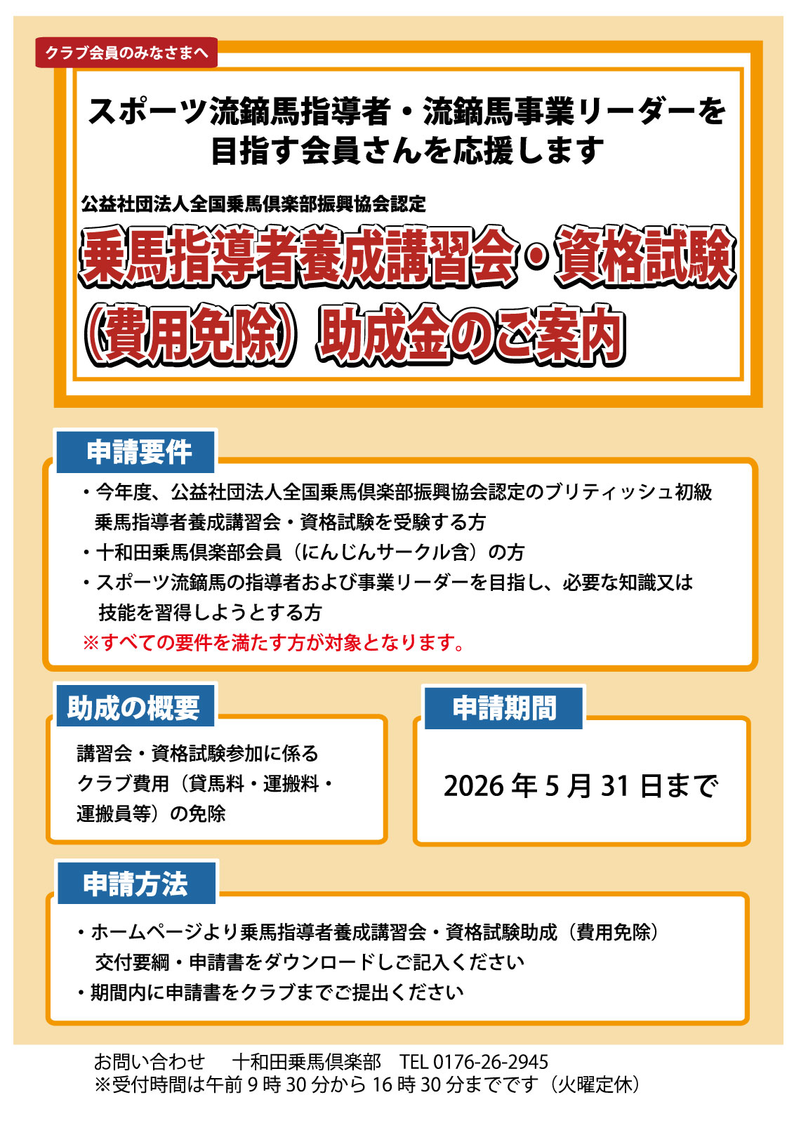 乗馬指導者養成講習会・資格試験 助成(費用免除)交付要綱・申請書ダウンロード
