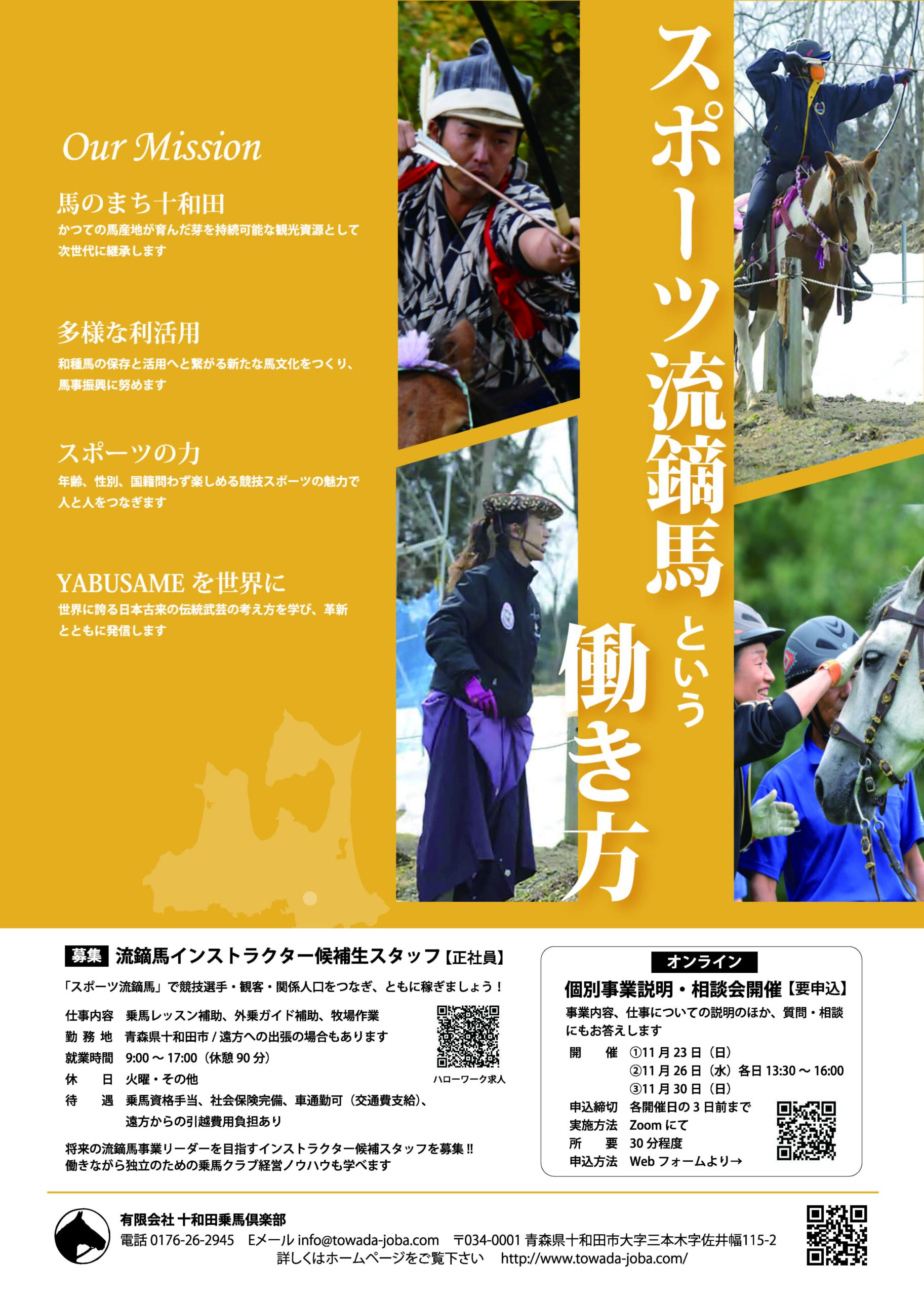 古来、名馬の産地として知られた青森県十和田市にて、日本古来の伝統武芸である流鏑馬を「スポーツ流鏑馬」として競技化し、「桜流鏑馬」「世界流鏑馬選手権」といったイベント開催で地域振興に努めてきた十和田乗馬倶楽部では、「100年後も続く産業化と次世代への文化継承」をビジョンに掲げ、競技選手(する人)・観客(みる人)・関係人口(支える人)それぞれに対応し、かつ繋げていく事業ネットワークモデルのビジネス構築に加え、「和種馬の保存と活用」「地域観光グローバル化」「若年者・女性活躍推進」「伝統神事等の後継者不足解消」といった社会課題の解決にもつなげていける事業の拡大を目指し、スタッフを新たに募集します。