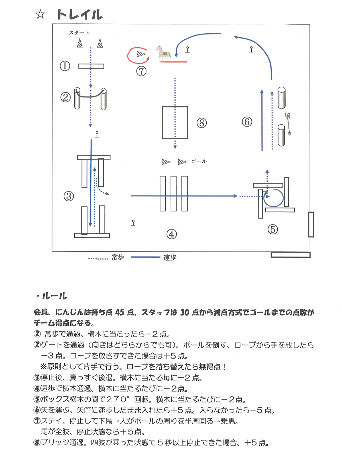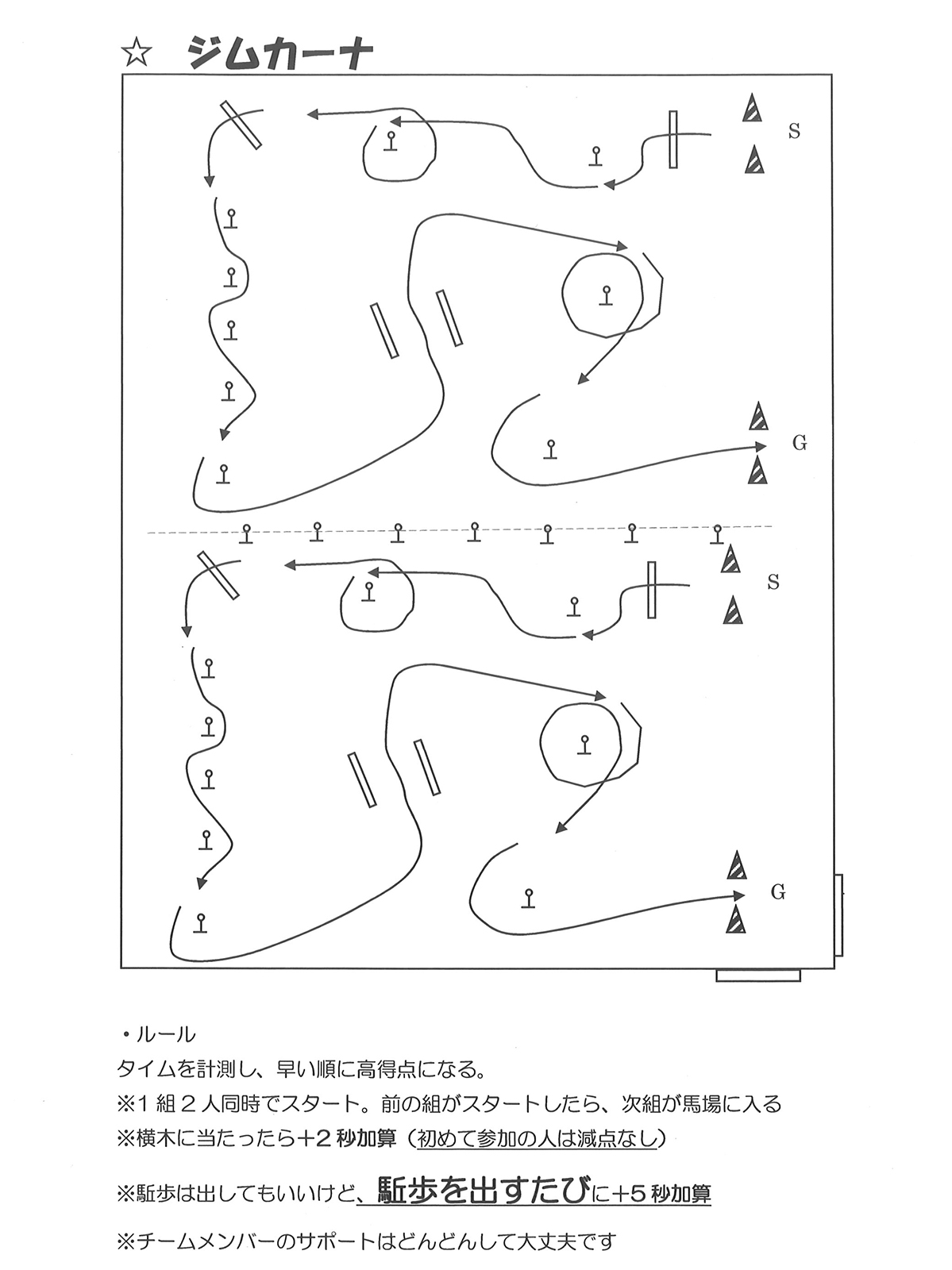 ①ジムカーナ(初中級者)&②トレイル(上級者)・・・横木通過やスラロームなどの障害物タイムレース、人馬の技術が求められる点数制競技。クラスはスタッフが振り分けます